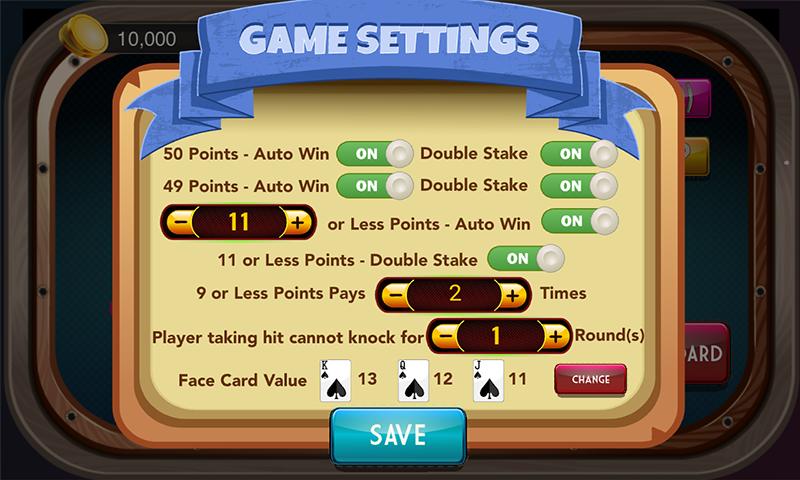 Tunk, popularly known as Tonk is a fast paced card game which is a kind of knock rummy and another interesting variation of Gin Rummy. There are various variations to play the Tonk or Tunk game. In this game each player will be dealt five cards and if it’s a 49 or 50 Points, it’s an auto win, also there are variations like 11 or fewer or 13 or fewer or 15 or fewer which is also an auto win. This is sometimes called as Tonk or Tunk or Knock. In such instance the hand is not played further and the player with 49 or 50 is paid twice the basic stake by all other players. If the player has 13, 12, 11 or fewer then the payment is thrice the basic stake. Also there is a special payment for a win if the player has 9 or fewer then the player gets quadruple payment of the basic stake. Offline Tonk – Tunk card game enables you to set the game variations, payouts and your desired game according to your preferable variations.
