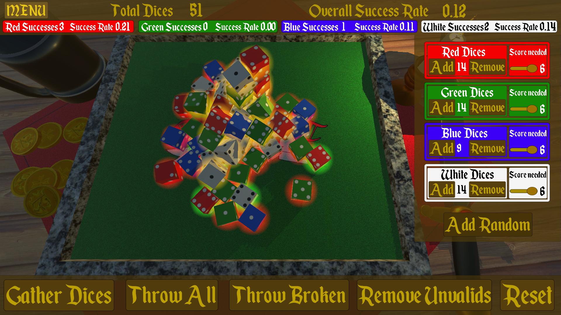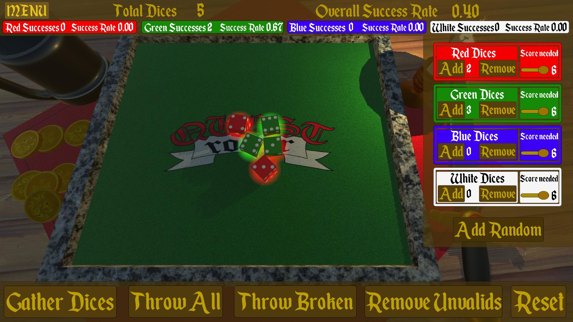 QuestRoller is an immersive and realistic dice tossing simulator for tabletop games which use six faced dices. QuestRoller includes an easy-to-use interface which eases the sorting of your dices and allow you to quickly sort those that passed their value test.