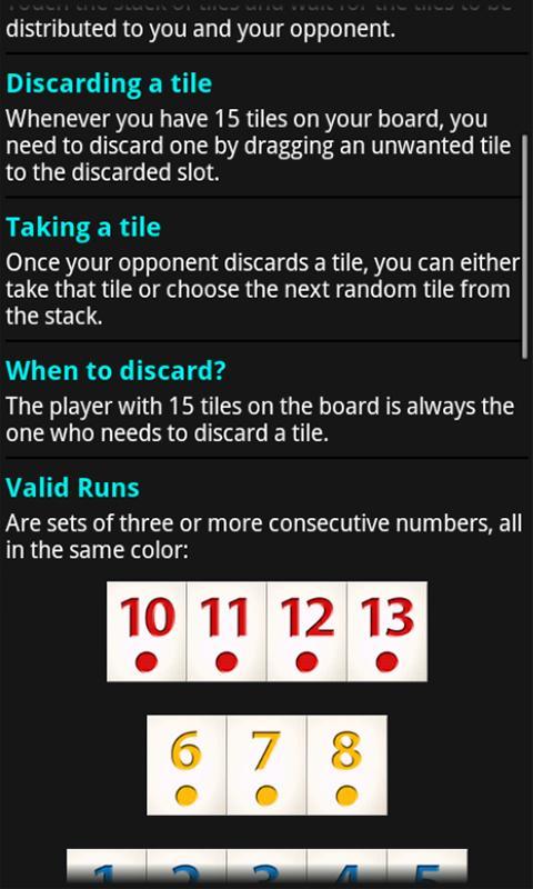 - Game-play: at any one point in time you will have either 14 or 15 tiles on your board and you will need to arrange all of them in either valid Runs and/or Groups