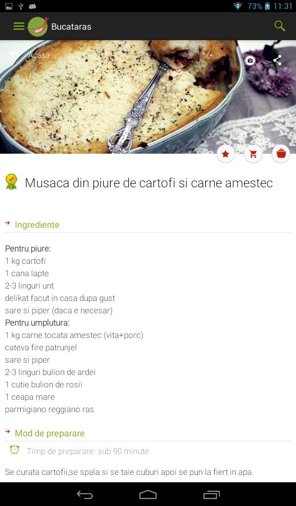Bucatarasアプリケーションでは、目的のレシピのために買い物リストを着用できます。別の施設は、電話アラームを設定する可能性があります。お気に入りのレシピを選択して友達を配布することは、1回のクリックから作られています。