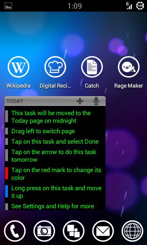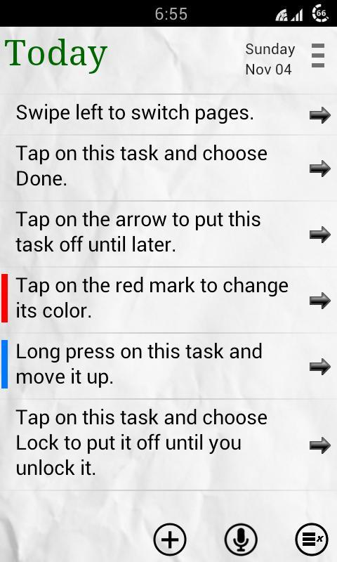 タスクを完了すると、完了したとおりにマークすることができます。その後、手動で削除するか、待つことができ、真夜中に自動的に削除されます。また、タスクをロックしたり、ロックを解除するまでリストに留めたり、明日のためにタスクを脇に置いたりすることもできます。毎朝、今日のページにすべての未完成のタスクがあります。通知をセットアップして、設定で未完成のタスクを思い出させることができます。また、各タスクを着色するオプションもあり、整理された状態を維持し、軌道に乗ることがさらに簡単になります!