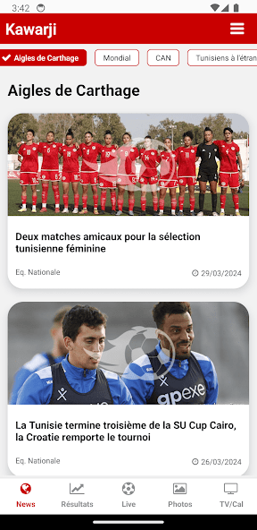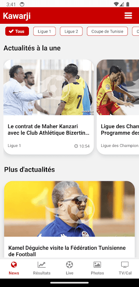 Kawarjiアプリを使用すると、チュニジアのフットボール大会をフォローできます。リーグ1、リーグ2、チュニジアカップ、ナショナルチーム、アフリカのCAF競技。チャンピオンズリーグ、カフェカップ、アフリカスーパーカップ、アフリカカップオブネイションズ(CAN)、アフリカ諸国チャンピオンシップ(CHAN)だけでなく、トップ5のヨーロッパフットボールチャンピオンシップ(LAリーガ、セリエA、プレミアリーグ、リーグ1、ブンデスリーガ)と世界最高の競争もあります。