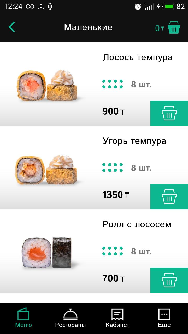 まず、寿司とロールをスマートフォンに配達するための排他的なプロジェクトです。アルマティとアスタナのマンガ寿司からのモバイルアプリケーション。ユーザーフレンドリーなインターフェイス、詳細なメニュー、高速注文処理。