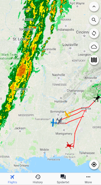 Spidertracksアプリケーションを使用すると、 Spidertracksアカウントを持つユーザーが飛行情報を表示し、Android電話でSpidertxtを使用して通信できます。ログインすると、アプリケーションには、フライトの歴史を含め、すべての航空機の場所をリアルタイムで表示します。ユーザーは、VFR、IFR High、IFR低いマップなど、さまざまなマップタイプの範囲にライブ天気の更新をオーバーレイすることもできます。