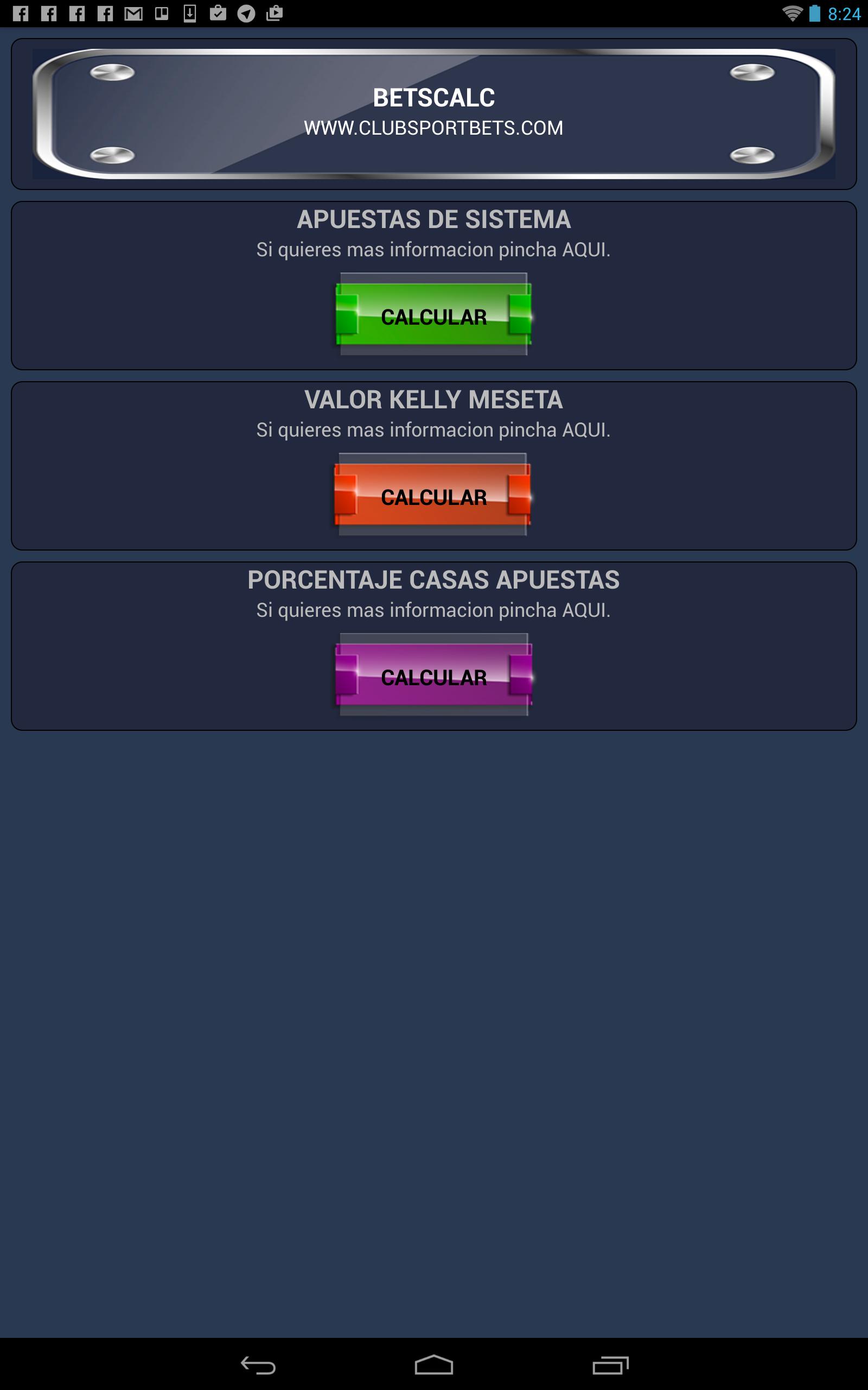 여기서 우리는 현재 버전의 BetsCalc 에서 기대할 수있는 것을 설명합니다. 새로운 기능이 도착했습니다 : 계산기 시스템 (게임 반복 유무에 관계없이), Kelly 및 Plateau의 가치 및 자금 관리 계산 및 북 메이커가 수행하는 비율을 계산합니다. 관심이 있으시면 우리는이 도구들 각각을 더 자세히 설명하여 원하는 것인지 결정할 수 있습니다.