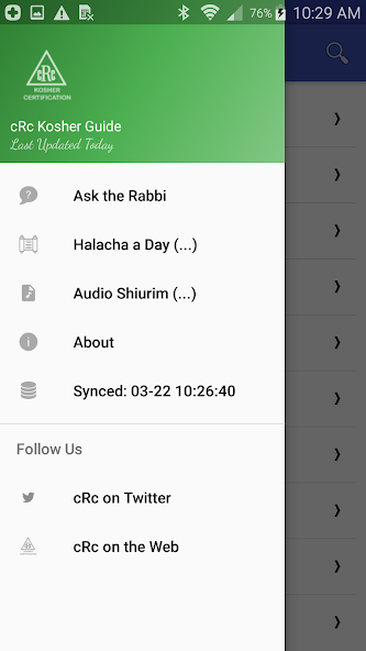 CRC 앱의 모든 데이터는 사용할 때 네트워크 연결이 필요하지 않고 장치에 상주합니다. 데이터가 하루에 한 번 백그라운드에서 원활하게 업데이트되면 사용자 경험 중단없이 최신 코셔 정보를 얻을 수 있습니다.