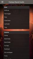 이 앱에는 판타지 레이스 (엘프, 하프링, 드워프, 하프 오크, 하프 엘브, 그놈 및 그 나이 웰 스무스 피부 인간)에 대한 모욕 목록이 포함되어 있으므로, 현대의 파울이 입은 버스트는 캐릭터를 깨뜨리지 않습니다.