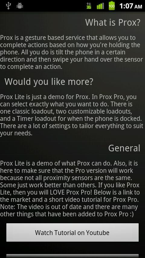 Prox Lite 는 휴대 전화를 건드리지 않고도 작업을 완료 할 수있는 제스처 기반 서비스입니다. 가속도계와 근접 센서를 사용하여 이러한 동작을 시작합니다. 휴대 전화를 원하는 방향으로 기울인 다음 근접 센서를 손으로 전달하십시오. 전화를 걸지 않고 브라우저를 시작할 때 진짜 제다이 느낌을 얻고 친구에게 깊은 인상을 줄 수 있습니다. 이 앱으로 힘이 강합니다. :)
