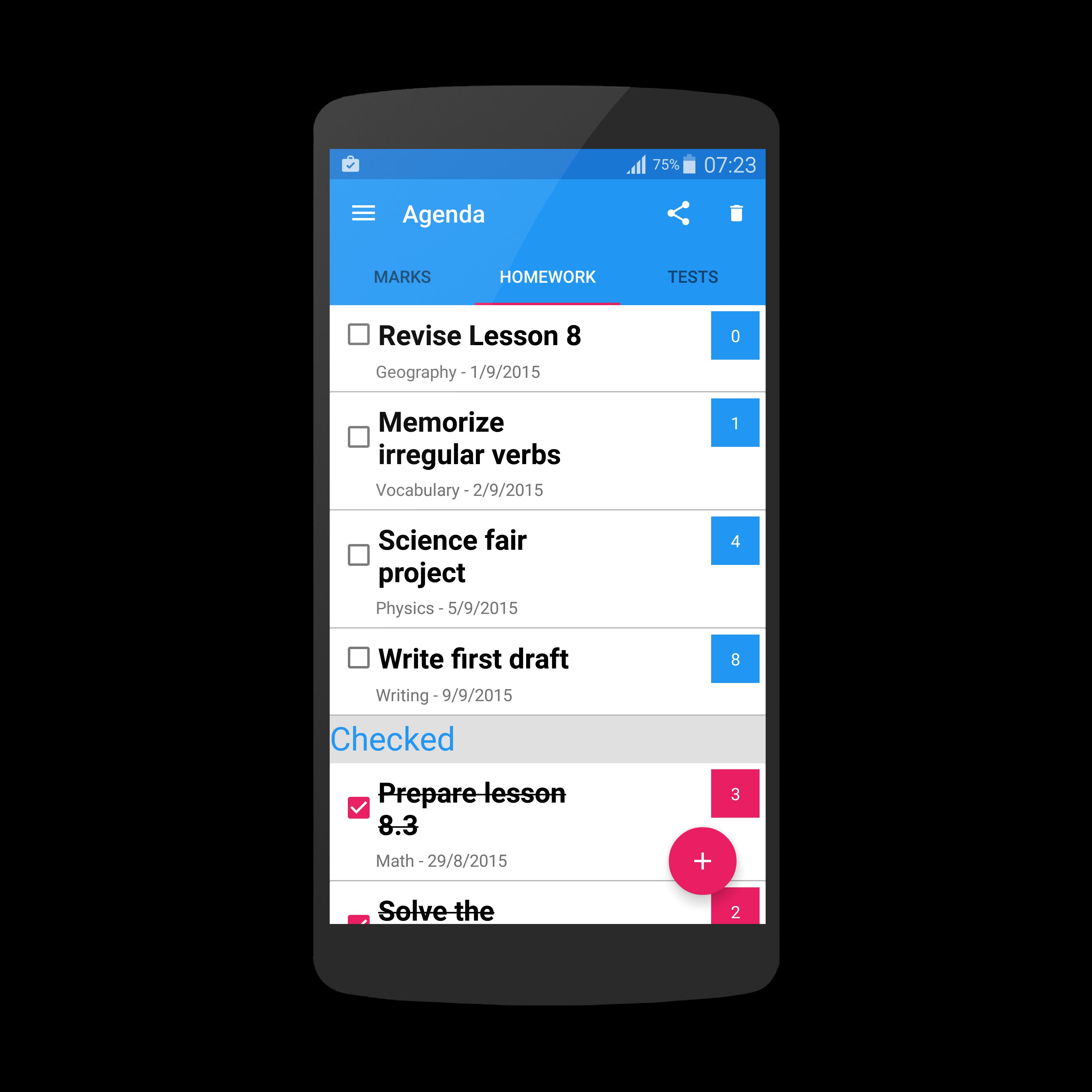 모든 마크를 저장할 수있는 연구 주최자는 모든 숙제와 다가오는 시험에 대해 알려줍니다. 똑똑하고 체계적인 학습 방식!