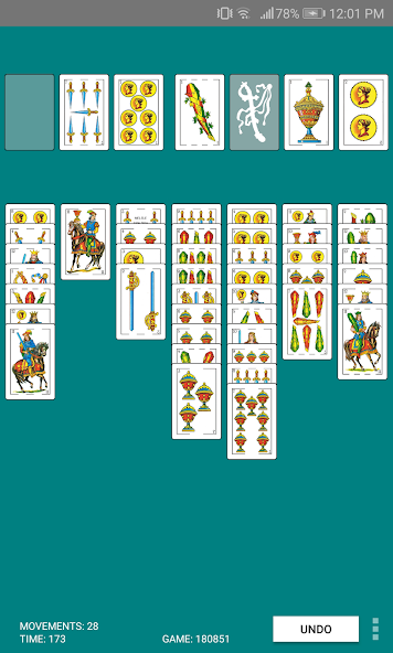 - 셔플 링 후 7 ~ 8 개의 카드 더미가 놓여지고 모든 카드가 보입니다. 부분적이거나 완전한 더미가 다른 슈트로 제작되면 이동할 수 있습니다.