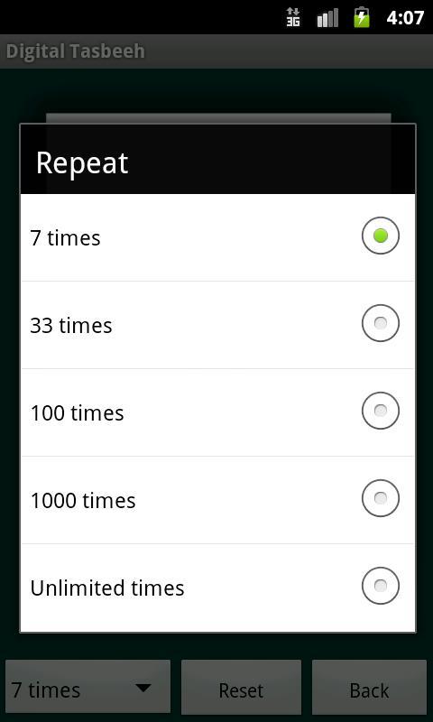 Este TASBIH digital permite selecionar o limite máximo para 7, 33.100, 1000 ou até limite ilimitado.