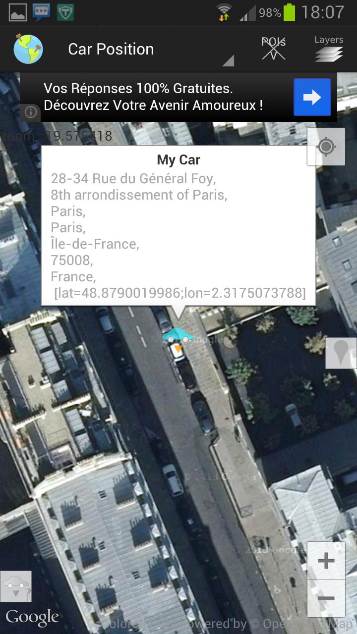 Há também um lembrete que ajudará você a se lembrar de onde você estacionou seu carro. Basta entrar no menu da "posição do carro" e clique há muito tempo no mapa para colocar seu carro. Quando você voltar ao aplicativo, no menu "posição do carro", clique no botão inferior esquerdo para localizar seu carro.