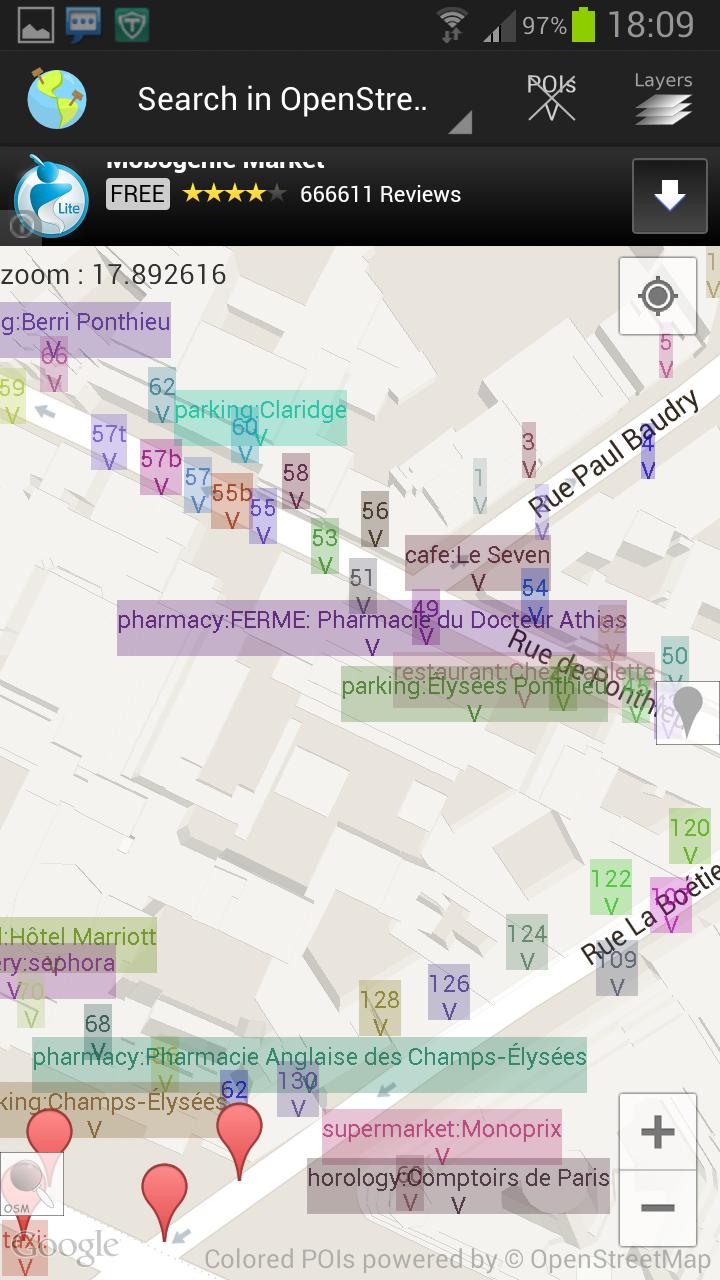 Você pode usar o Nominatim para procurar nomes de rua (os resultados aparecerão dependendo da região visível do mapa) e usar um mecanismo de pesquisa avançado para procurar pontos de interesse no OpenStreetMap. (Por exemplo, você pode pesquisar a culinária asiática ou um hotel de 4-5 estrelas ... etc. Você pode pesquisar em torno de você dentro de um raio, ou na região visível do mapa, ou em todo o mundo).