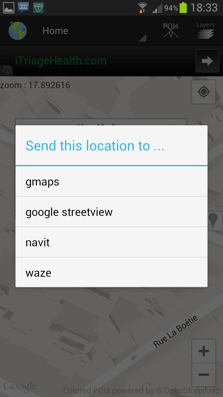 Clique na janela de informações que aparece e você pode enviar a posição para qualquer aplicativo que suporta filtros de intenção (Waze, Navit, Google Streetview, ...)
