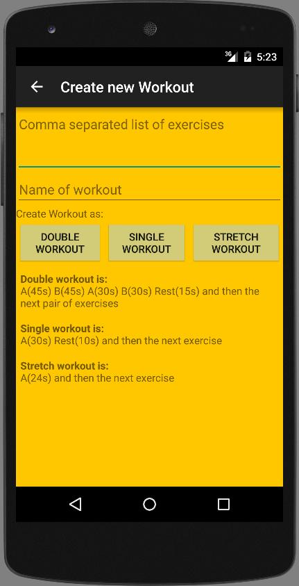 Você também pode criar seus próprios exercícios com seus próprios exercícios, basta dar um nome ao seu treino e escrever uma lista separada por vírgula de exercícios e seu bem para ir!