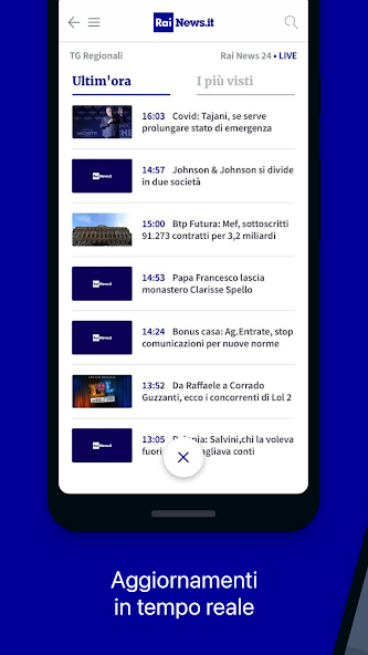 Da redação digital de Rai, todas as notícias principais atualizadas em tempo real, contadas com palavras e imagens exclusivas de todo o mundo, confiáveis e certificadas, uma garantia contra notícias falsas. Além disso, a possibilidade de visualizar reportagens nacionais e a transmissão direta de 24 horas de RaiNews 24 a qualquer momento. Os 24 sites regionais do TGR e todas as edições de programas de notícias locais também estão disponíveis com um clique.
