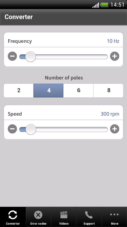O aplicativo SINAMICS Support desenvolvido por Siemens converte a frequência (Hz) de uma unidade de velocidade variável para a velocidade (rpm) a ser definida no motor. O resultado é exibido com uma precisão de dois lugares decimais. A conversão também funciona de outra maneira: as revoluções por minuto se tornam Hertz.