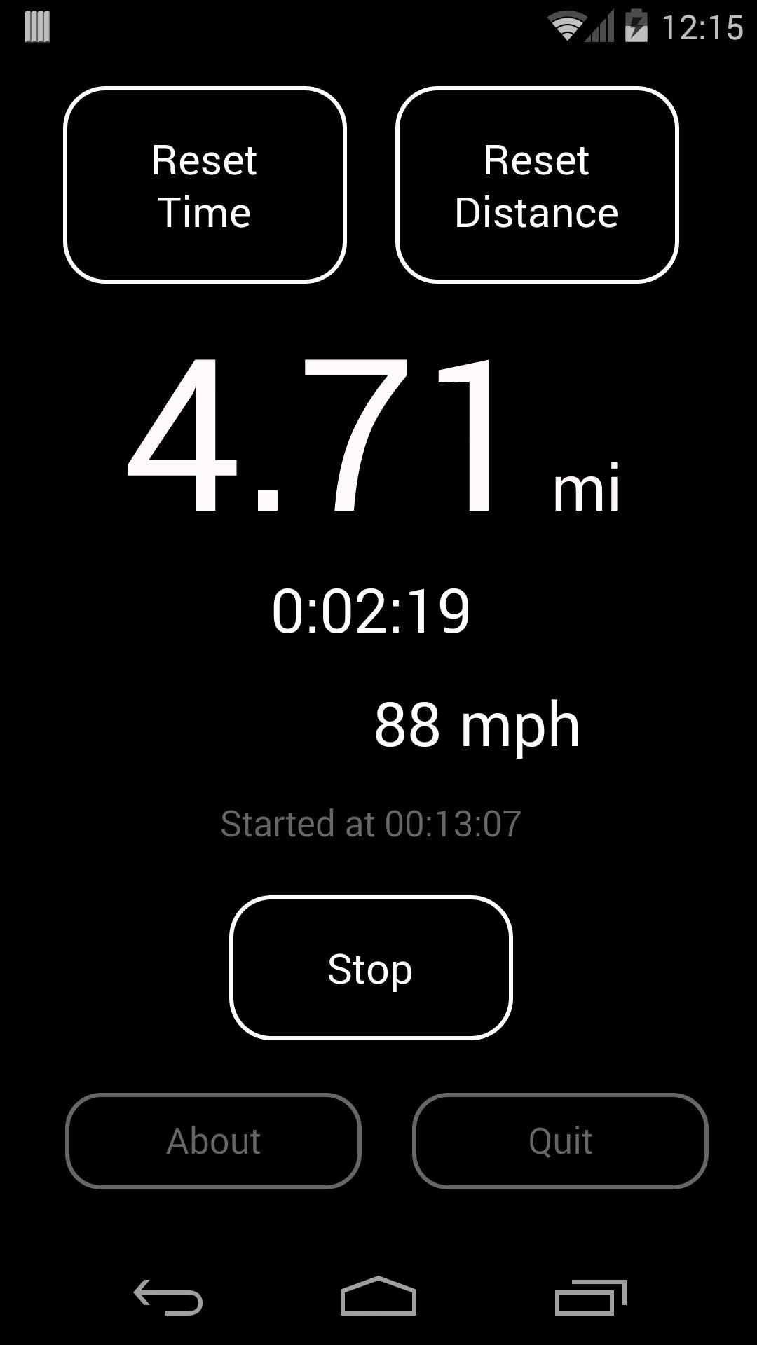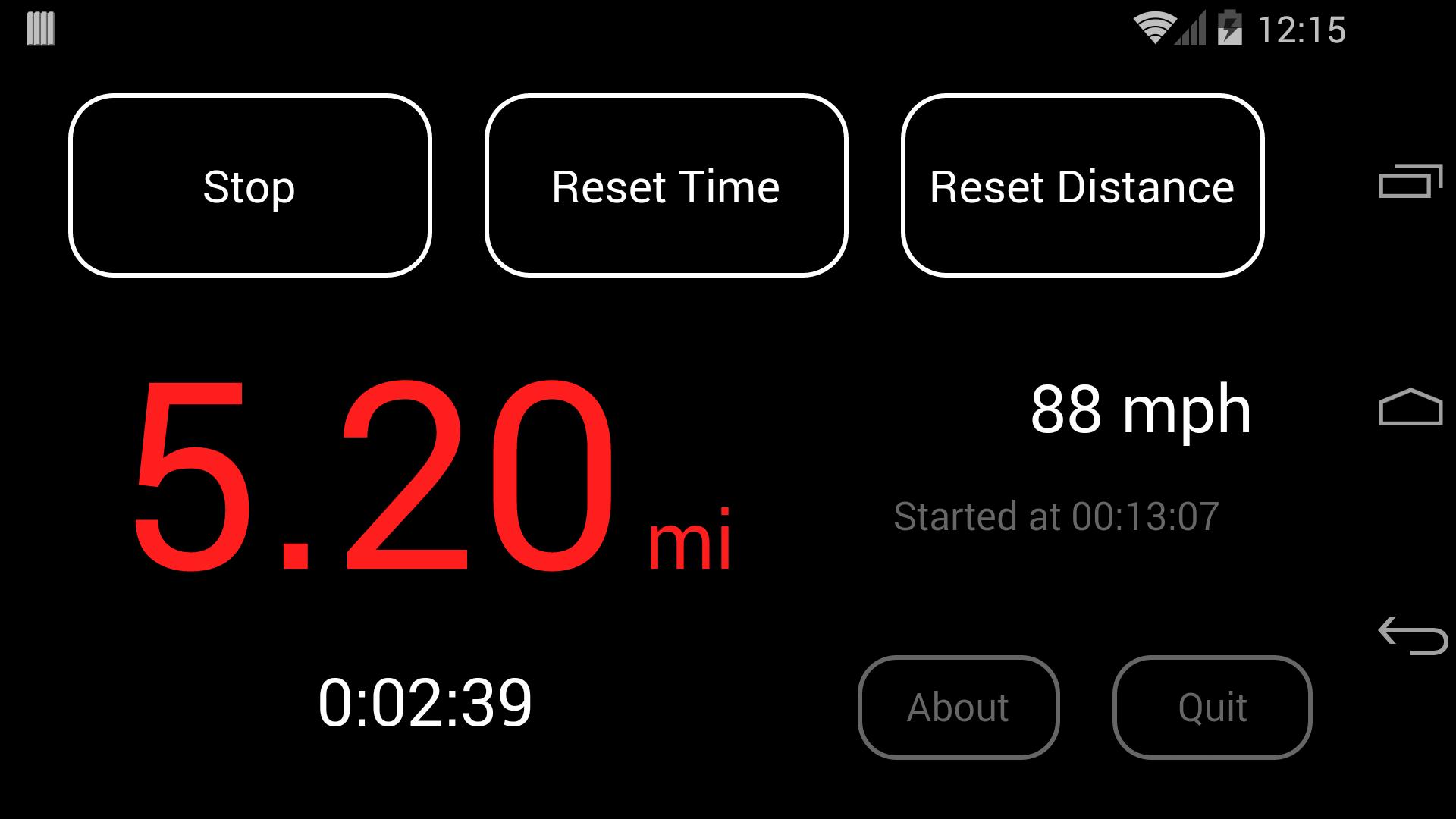 Basta inserir sua velocidade média direcionada em MPH (toque em 'Toque para definir' o texto ao lado de 'MPH') e pressione o botão Iniciar. O contador de distância exibirá a distância teórica percorrida. Também apitará a cada milha de 0,1 milha para fornecer feedback não visual adicional ao copiloto.