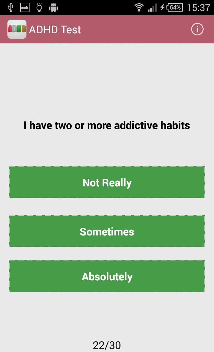 Отказ от ответственности: Сделано для образовательных целей, чтобы повысить осведомленность об общих симптомах. Добавить и СДВГ - серьезные состояния, и ни один мобильный или онлайн -тест не может дать реалистичный диагноз. Если вы подозреваете, что страдаете от этого состояния, пожалуйста, поговорите с профессионалом.