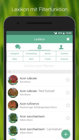 Кроме того, для сообщества AndyGreen мы предлагаем библиотеку растений с более чем 3000 растений. Каждое растение содержит одно или несколько картин, с профилем, показывающим ботаническое название, высота, среду обитания, цветок, цвет цветов, фрукты, листья, рост и использование. Вы можете добавить личные заметки на каждое растение.
