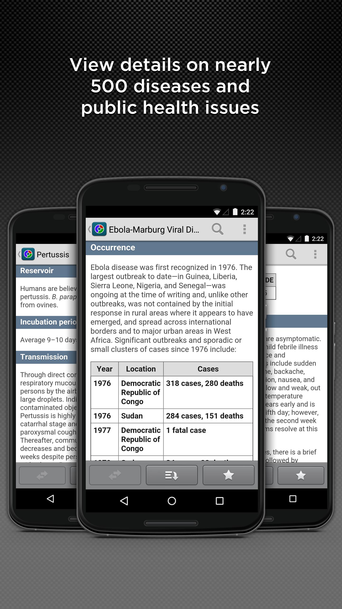 В течение почти 100 лет контроль над инфекционными заболеваниями был одним из наиболее широко признанных и авторитетных ссылок для работников общественного здравоохранения в каждом углу мира. Этот написанный экспертом ресурс предоставляет информацию об выявлении, управлении и предотвращении инфекционных заболеваний непосредственно на вашем смартфоне, планшете и в Интернете.
