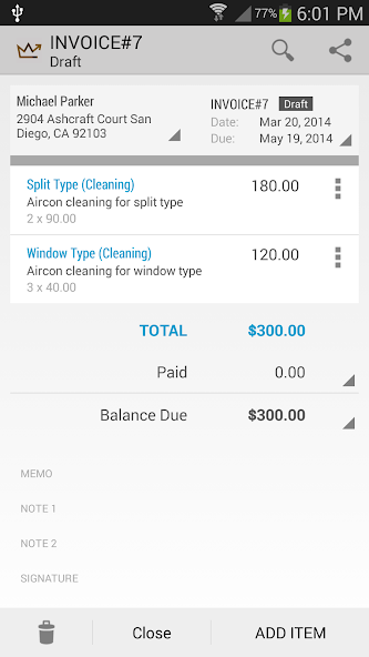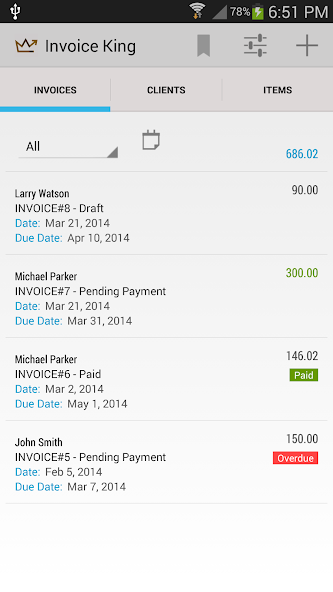 Invoice King создает профессиональные счета и оценки. Если вы фрилансер, владелец малого бизнеса или подрядчик, это приложение может вам очень помочь. Вы можете отправить счет в PDF -фактуру своим клиентам или поделиться счетом PDF с существующими приложениями на вашем телефоне, например, Whats App или Skype.
