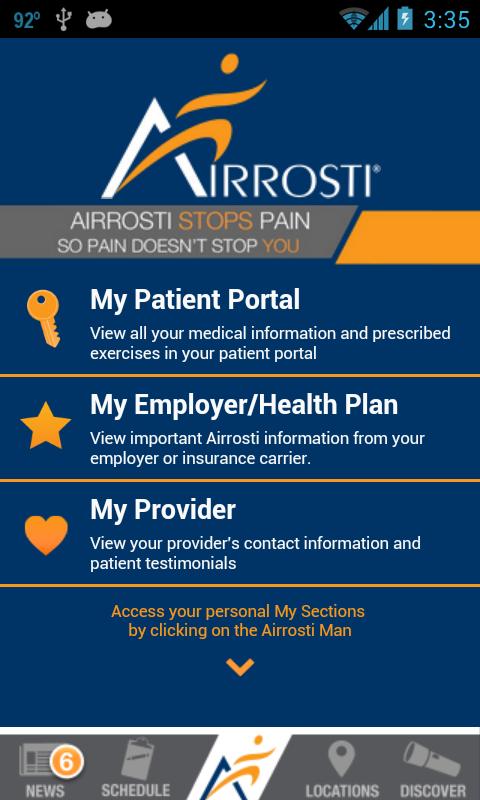 Доступ к последней новостной и медицинской информации. Пациенты с AirRosti также имеют доступ к просмотру своей личной учетной записи и медицинской информации, просмотра прописанных упражнений, чтобы помочь ускорить восстановление и предотвратить будущие травмы, связаться со своим поставщиком Airrosti и отслеживать встречи и другую личную информацию.