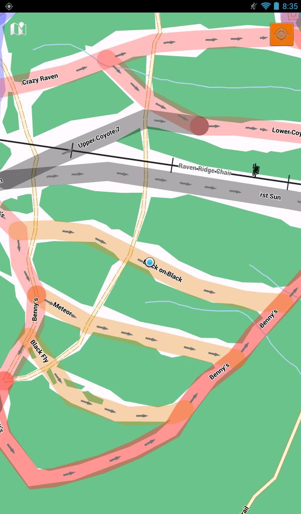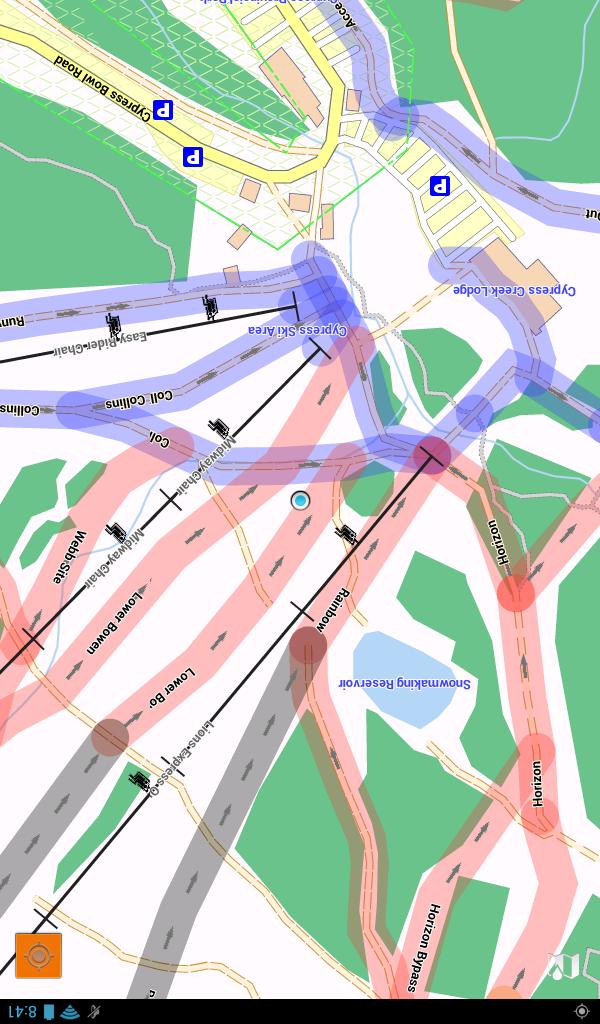 С помощью «Режим карты курорта» мы переносим ваше текущее местоположение широты/долготы в положения x/y карты изображений, которую обеспечивает Cypress Resort. Вы можете лучше понять, где вы находитесь на лыжных тропах.
