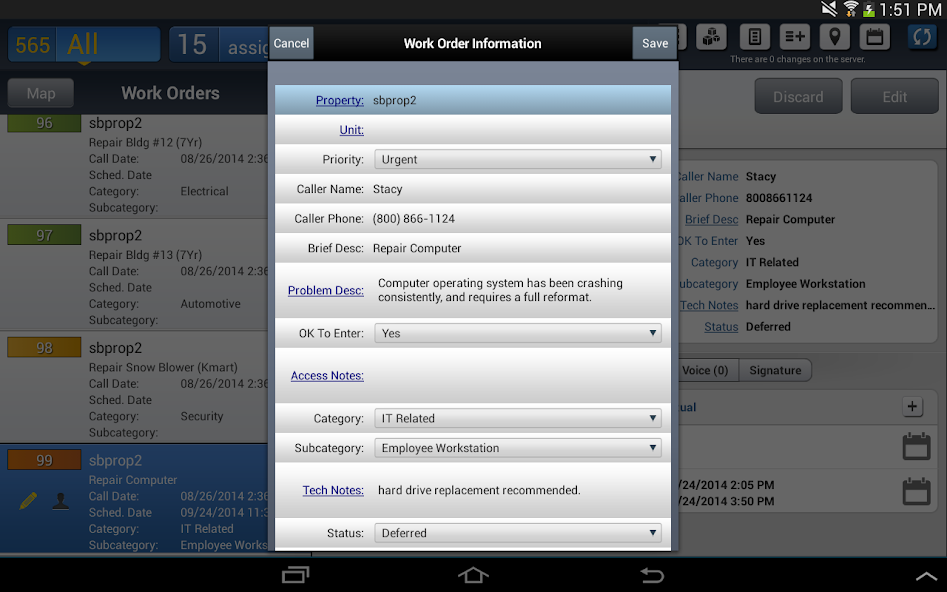 Менеджеры по техническому обслуживанию могут легко отслеживать техников, назначать рабочие заказы и управлять задачами по техническому обслуживанию со своего планшета. Технические местоположения могут отображаться на карте, когда техники используют мобильные устройства для обслуживания Yardi. WO может быть запланировано через процесс перетаскивания.