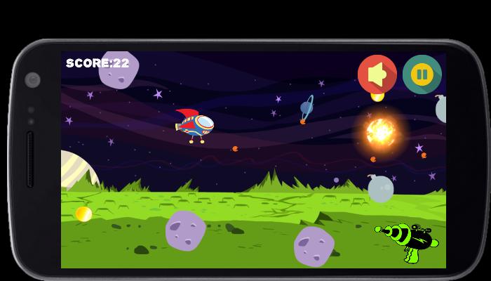 Spaceman Saul должен доставить свой космический корабль в безопасное место. Однако его путь заполнен метеоритами и инопланетянами. Помогите ему пройти.