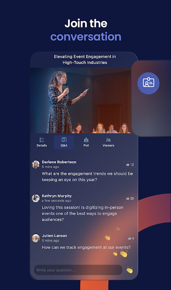นำกิจกรรมของคุณไปยังผู้เข้าร่วมหลายพันคนไม่ว่าพวกเขาจะอยู่ที่ใด ทำให้กิจกรรมเข้าถึงได้ง่ายขึ้นและครอบคลุมมากขึ้นด้วยคำบรรยายภาพสดการแปลและเนื้อหาตามความต้องการ สร้างโอกาสในการสร้างเครือข่ายสำหรับทุกคนไม่ว่าจะเป็นแบบตัวต่อตัวหรือระยะไกล สร้างกิจกรรมด้วยเทมเพลตที่ใช้งานง่ายและหน้าลงทะเบียนที่ปรับแต่งได้เพื่อให้ผู้ชมของคุณได้รับประสบการณ์ที่ดีที่สุดของแบรนด์