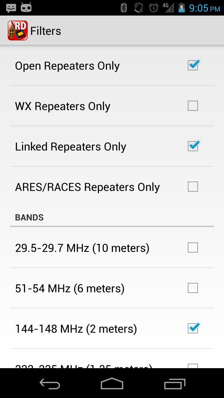 ➢การเลือกตัวกรอง repeater โดยแอตทริบิวต์ของพวกเขา: เปิด repeaters เท่านั้น, ซ้ำกับข้อมูลสภาพอากาศ, ตัวทำซ้ำที่เชื่อมโยงและตัวทำซ้ำ ARES/Races