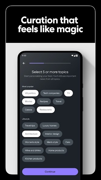 การปรับให้เป็นส่วนตัว: ติดตามข่าวที่คุณใส่ใจผ่านฟีดส่วนบุคคลที่ปรับให้เข้ากับความสนใจของคุณในขณะที่ช่วยให้คุณได้รับการแจ้งให้ทราบเกี่ยวกับหัวข้อข่าวที่สำคัญที่สุด เข้าถึงเรื่องราวหัวข้อและผู้เผยแพร่ที่สำคัญที่สุดสำหรับคุณได้ทันทีและปรับการตั้งค่าของคุณได้ตลอดเวลาเพื่อปรับปรุงฟีดและการแจ้งเตือนของคุณ บล็อกคำหลักหรือผู้เผยแพร่เฉพาะที่คุณไม่ต้องการได้ยินและทำให้ฟีดข่าวของคุณเป็นของคุณเป็นพิเศษ