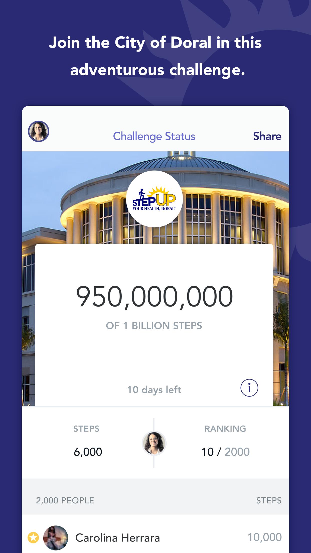 ความคิดริเริ่มด้านสุขภาพของนายกเทศมนตรี“ Step Up Your Health, Doral” เป็นโครงการตลอดทั้งปีที่จะกระตุ้นให้ชุมชนเข้าร่วมนายกเทศมนตรีในการดำเนินชีวิตที่มีสุขภาพดีขึ้น ความท้าทายหลักคือ“ เมืองแห่งหนึ่งพันล้านขั้นตอน” ซึ่งผู้เข้าร่วมจะติดตามขั้นตอนของพวกเขาเพื่อให้ได้ทั้งหมดเป็นพันล้านในทั้งหมดในหนึ่งปี นอกจากนี้ยังมีโปรแกรมโภชนาการและการออกกำลังกายและกิจกรรมการสัมมนาการคัดกรองสุขภาพและงานแสดงสินค้าเพื่อสุขภาพที่จะช่วยให้คุณมีชีวิตที่มีสุขภาพดีขึ้น!