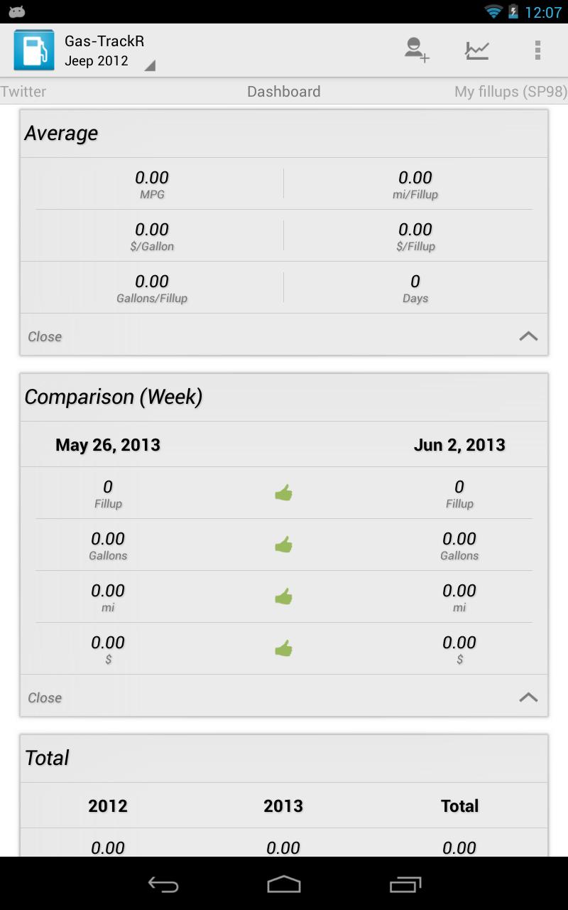 仪表板的视图为您提供了数据的快速清晰概述,其卡片具有不同的卡:平均时间,时间比较和总计。您可以在数周,几个月和几年的时间内轻松跟踪汽油消耗!