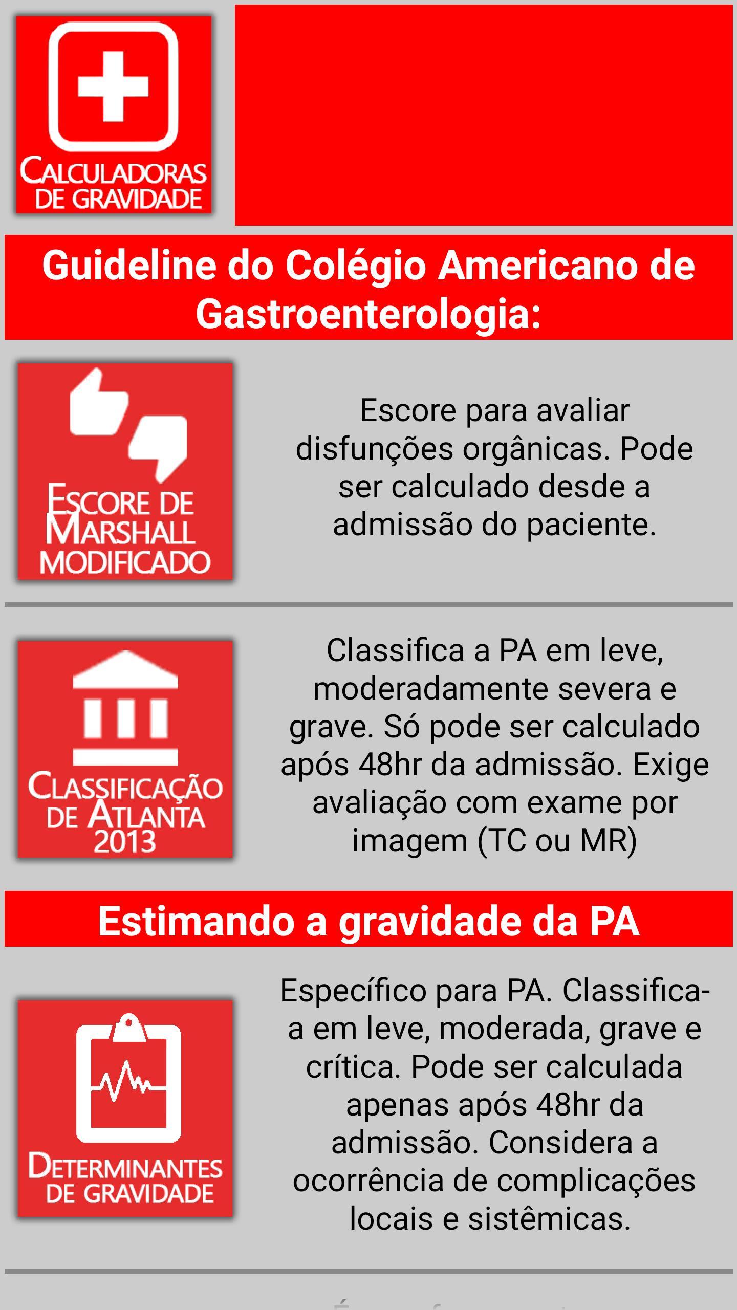 这些应用中包含的信息是基于圣卡斯萨·德·保罗·中央急诊室的急性胰腺炎所采用的,该急诊室可在Tercio de Campos和Samir Rassian的“急性胰腺炎”一书中获得,以及美国胃肠病学的美国最新指南(2013年)(2013年)。