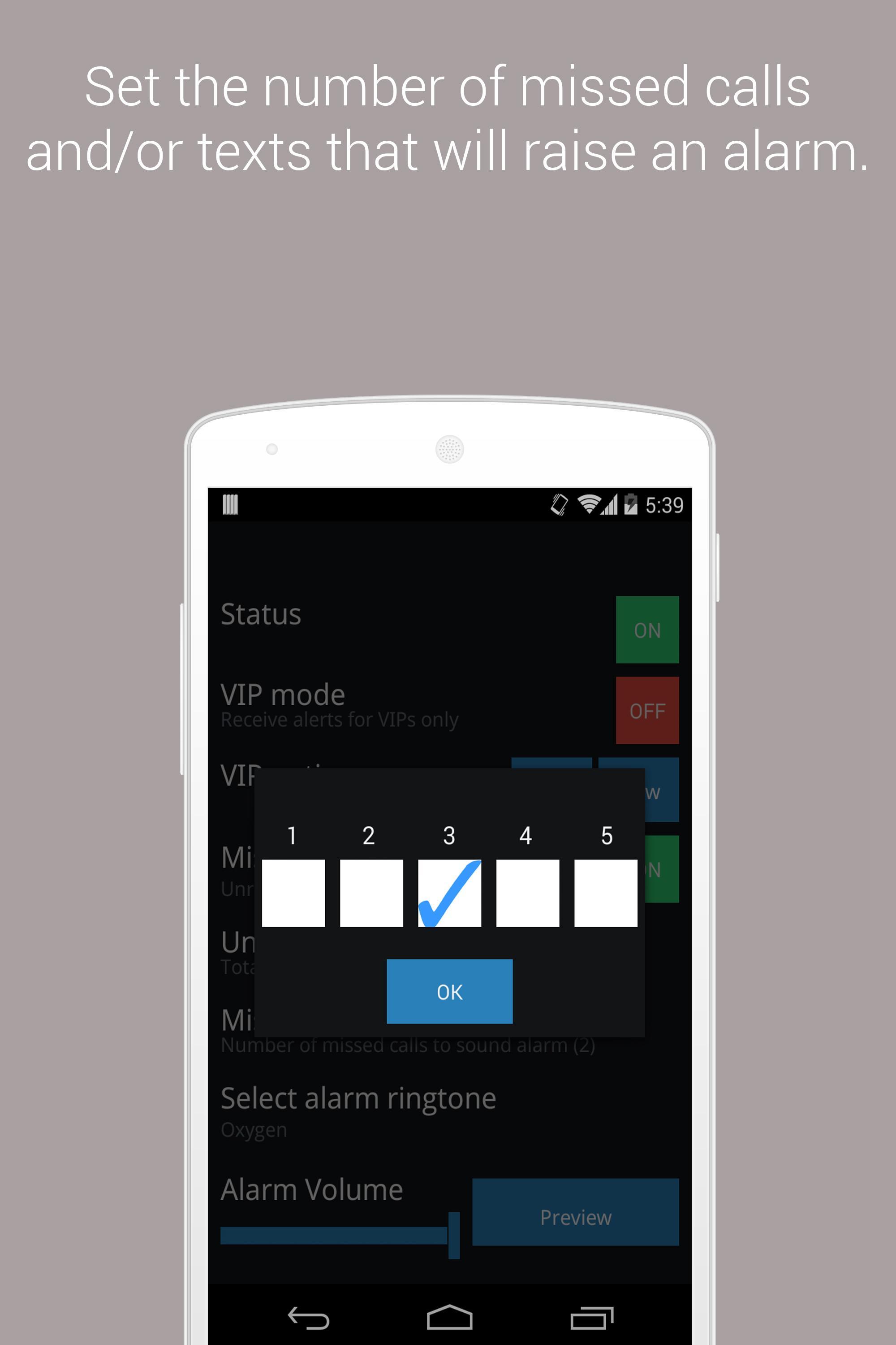 只需在警报声音之前选择未接听电话和/或文本的数量即可唤醒您。请注意,每个呼叫者的未通话计数都保持分开,而未读文本则保存为总计。