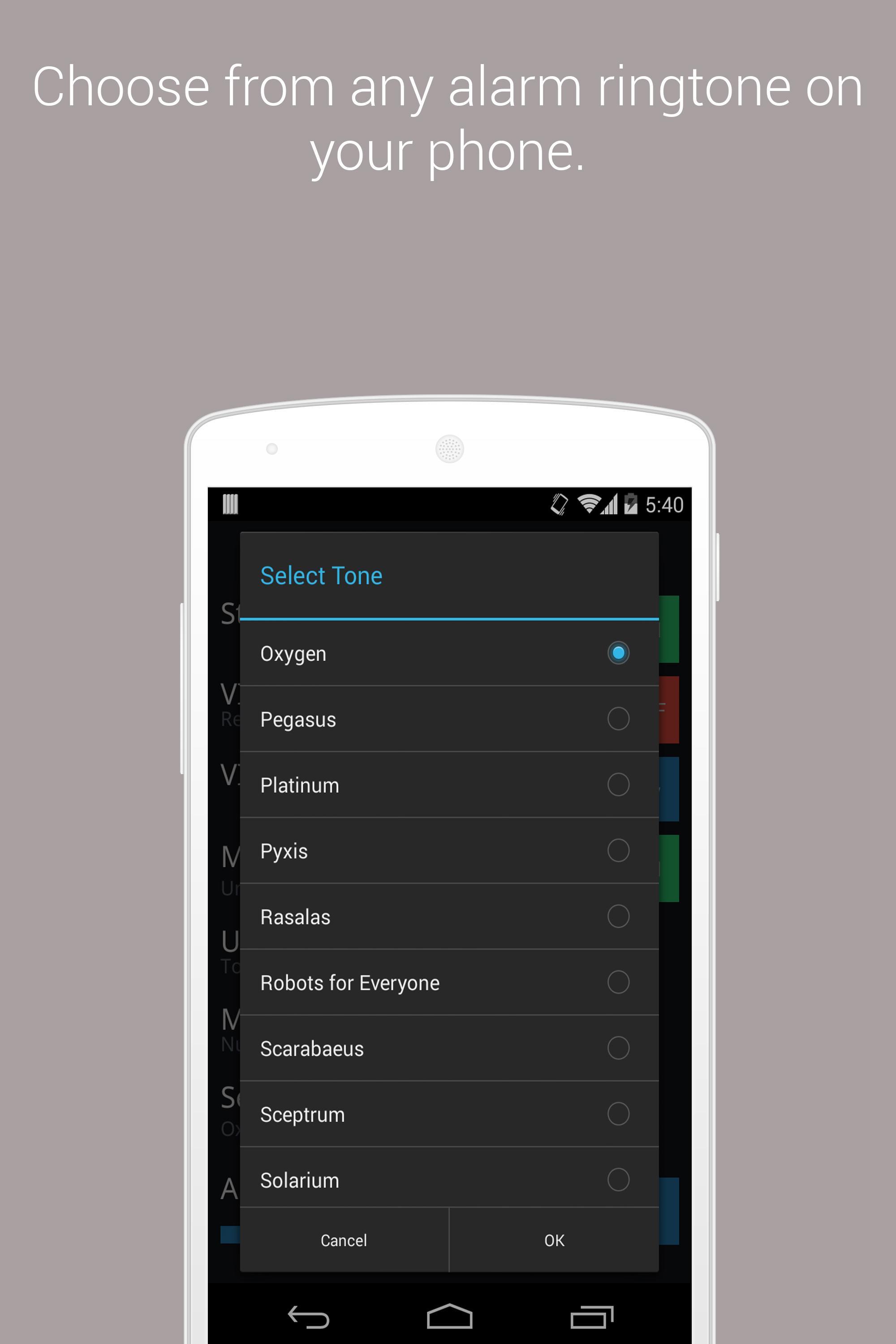 - 从手机上安装的所有警报声音中选择。