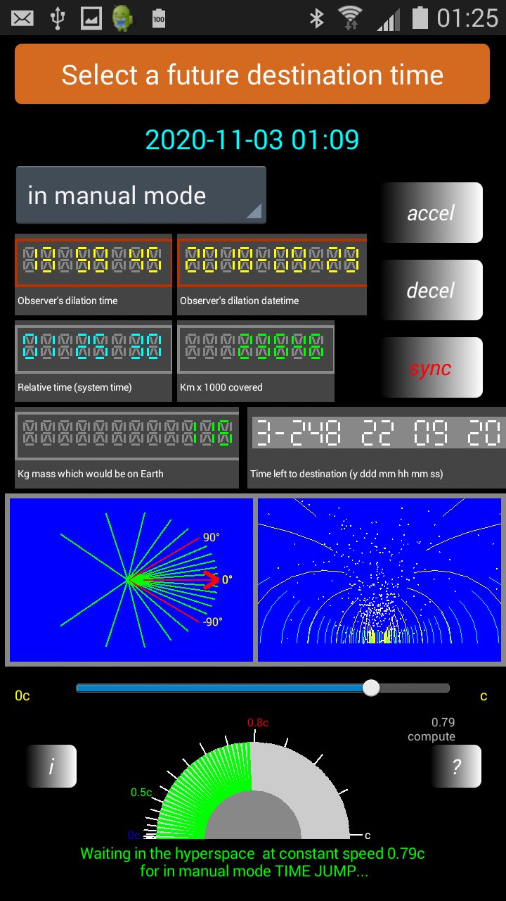 一切完成后,您将看到这样的动画,其中时钟的时间因相对论效应而不同,并且质量会增加。还显示了覆盖的公里数。