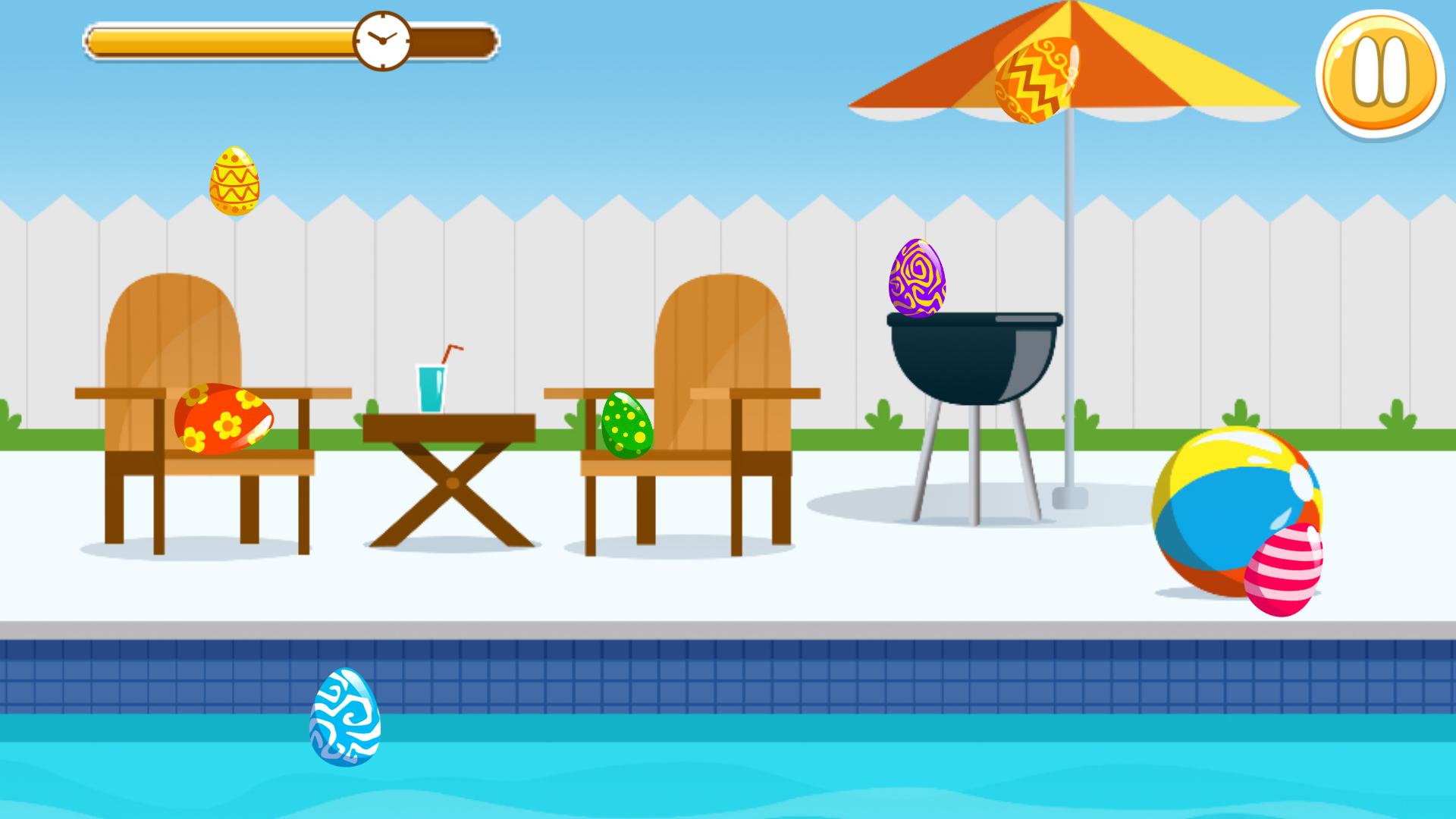 复活节来了!这个假期最令人兴奋的是什么?油漆鸡蛋!粉红色,绿色,蓝色,红色 - 您想要的任何颜色!您可以绘制一些图案,甚至可以创建独特的设计。但是这次您的任务是在房子里找到这些惊人的鸡蛋!漂亮的宠物将帮助您完成任务。您将有一些地点:客厅,后院,厨房,游泳池,托儿所和橱柜。在每个房间里,鸡蛋都是隐藏的。找到每个鸡蛋并成为赢家。
