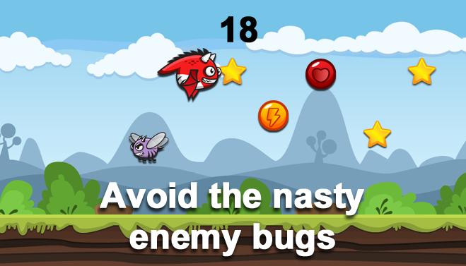 点击屏幕以制成红龙蝇。捕捉所有星星和电源,避免虫子。