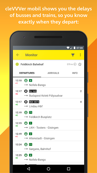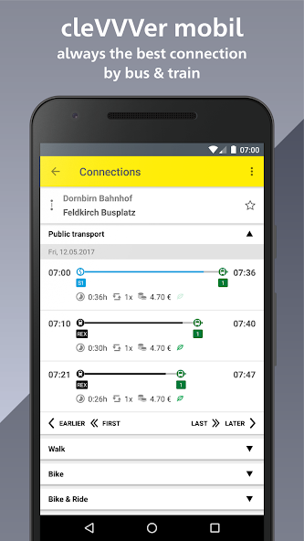 VVV的cleVVVer mobil時間表應用程序是Vorarlberg及其他地區公共交通的理想伴侶。所有公共汽車,火車,電車等的移動旅行信息在整個奧地利和列支敦士登都向用戶介紹了當前的出發時間,最佳連接,替代路線和中斷。此外,它允許用戶顯示從任何地址或當前位置到他們保存在智能手機中的所有聯繫地址的連接。