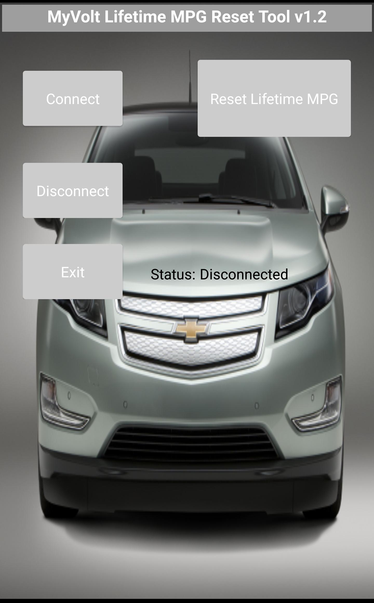 我的Volt LifeTime是一個快速的工具,可以使用OBDLINK MX藍牙或兼容的ELM327藍牙模塊重置2011年雪佛蘭Volt的壽命MPG。並非每個ELM327藍牙模塊都可以使用此應用程序。如果您有任何錯誤或檢查引擎燈,請不要繼續使用MyVolt工具或嘗試使用其他ELM327適配器。有關最兼容性,請使用scantool.net obdlink mx藍牙適配器。與Chevrolet Volt 2011-2015和Opel Ampera 2012-2015兼容