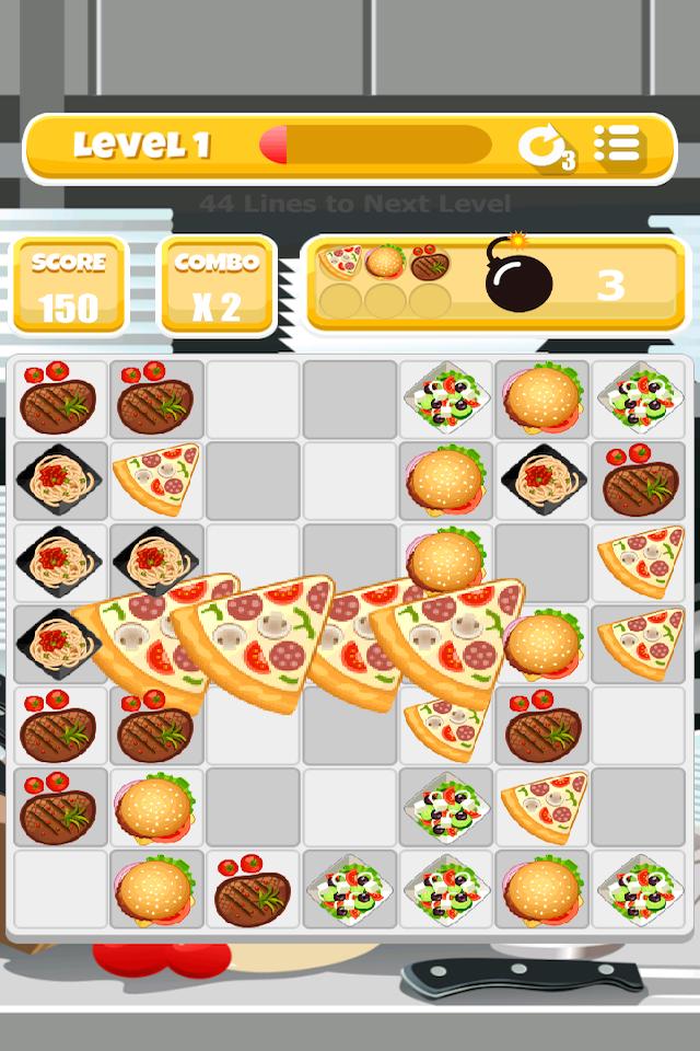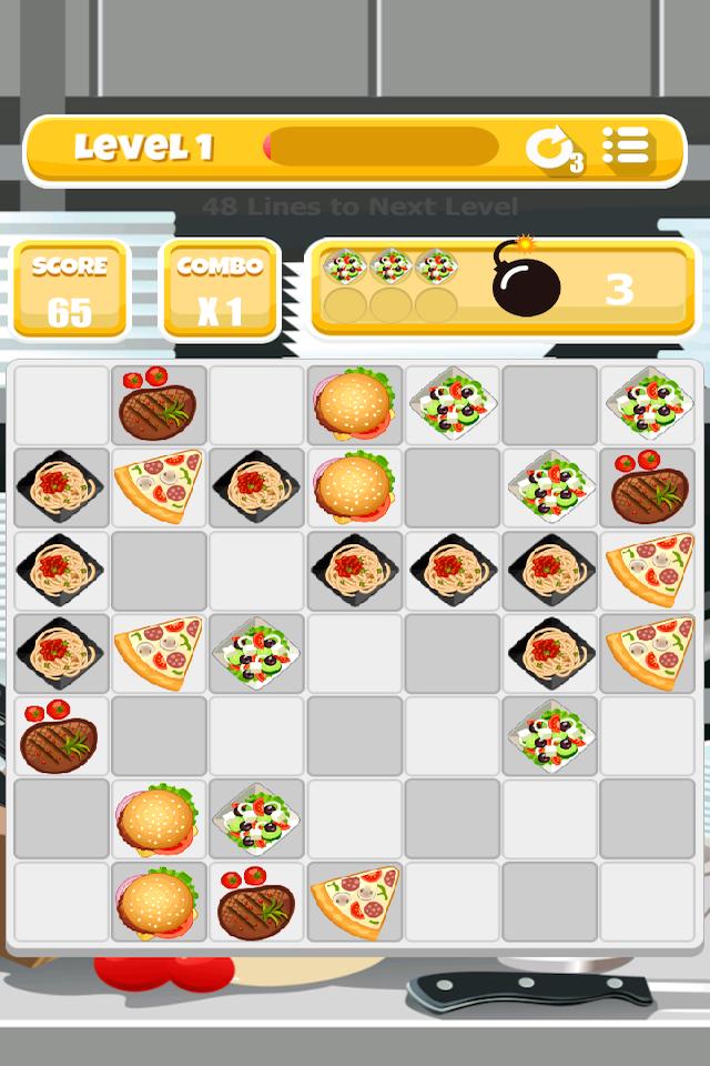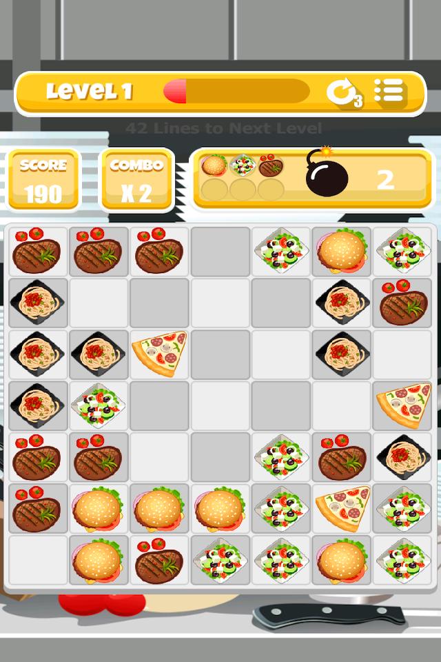 玩Ultimate Connect 4益智遊戲!一旦您開始演奏,它上癮,超級有趣,很難放下。單擊一頓飯,然後將其拖到開放的瓷磚上以移動其位置。連接四個或更多的餐,這些飯菜在一條線上水平,垂直或對角線連接以清除它們並接收點。使用3枚炸彈去除阻止您建立連接的餐點。清除50行以移至下一個級別。