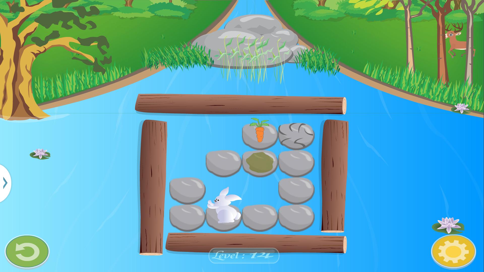 沿著難題移動並獲得胡蘿蔔!請注意,有些石頭是可損壞的。如果我們的兔子在池塘上,他們可能會沉入池塘。有些很滑。隨著水平的增加,挑戰將增加。